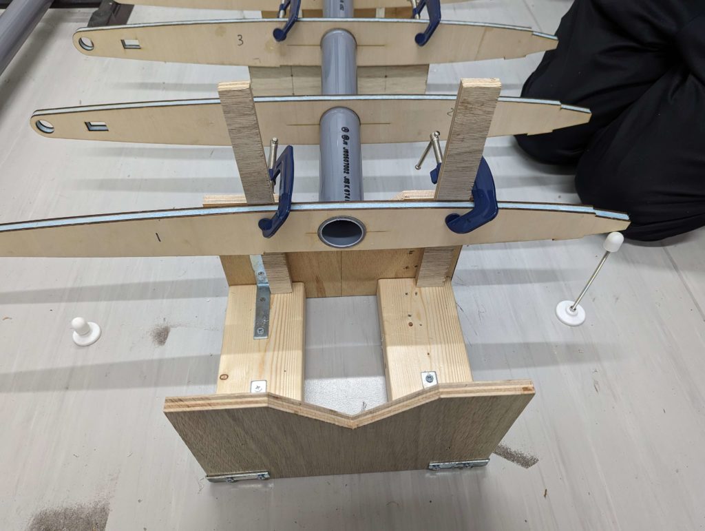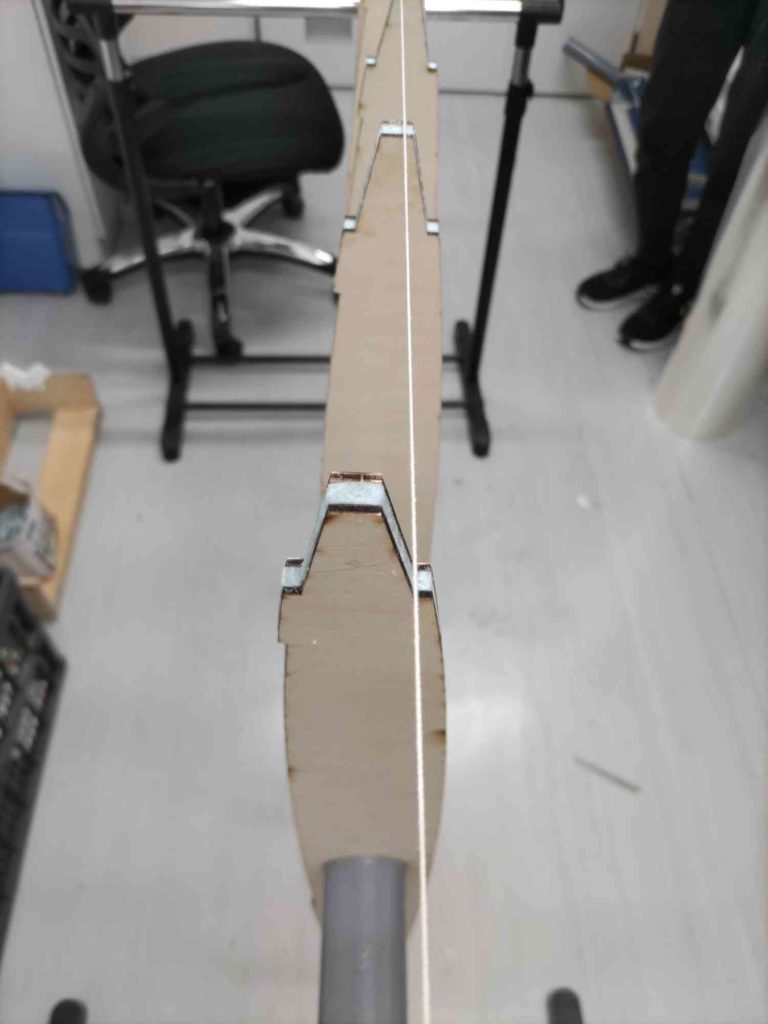 端のリブ同士にタコ糸を貼り付けてリブの精度を確かめました。写真の通り、かなりずれていました。次回の作成時には、いま1回生に作成してもらっている治具を使用します。とても楽しみです。